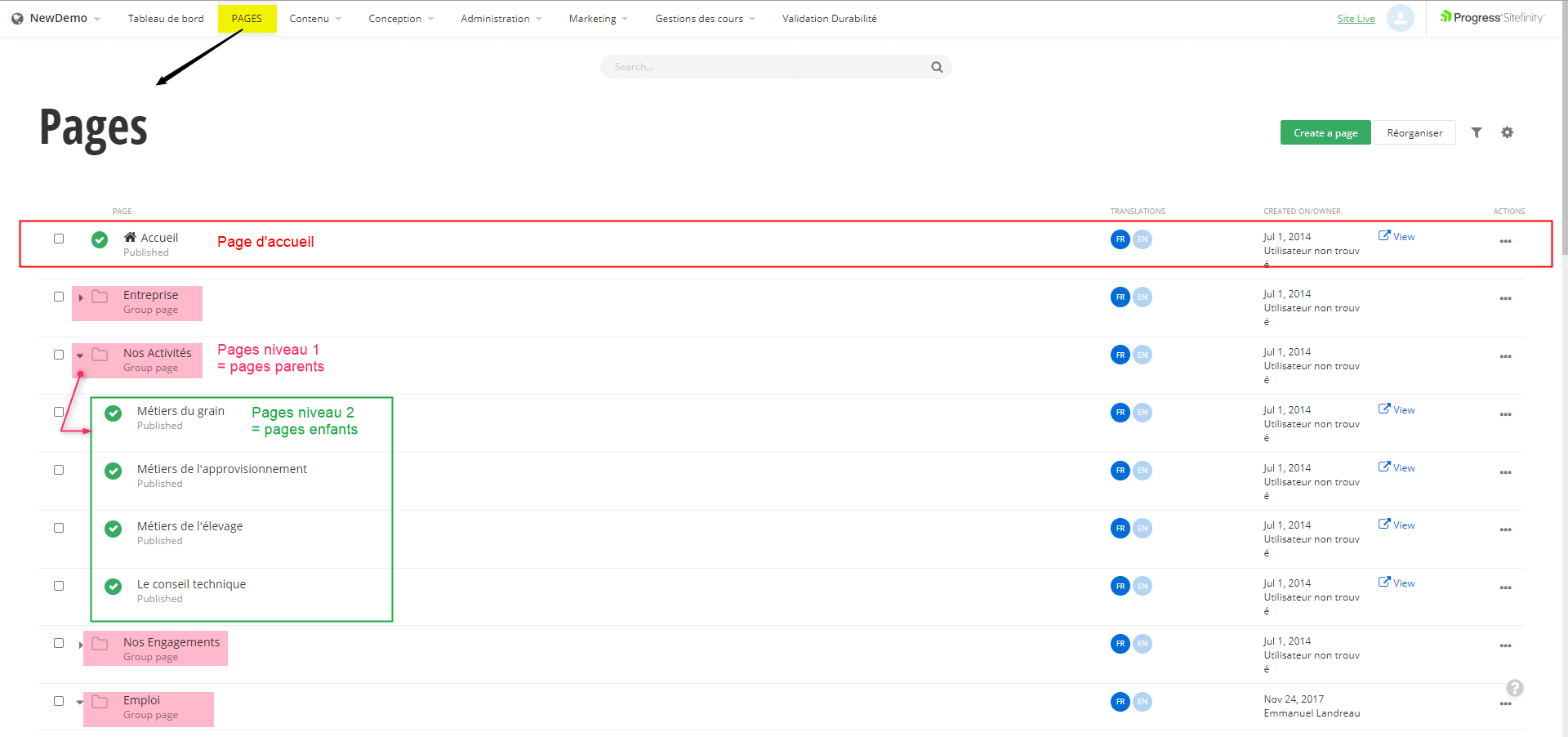 L'arborescence montre la hiérarchie entre les différentes pages du site (onglet PAGES).