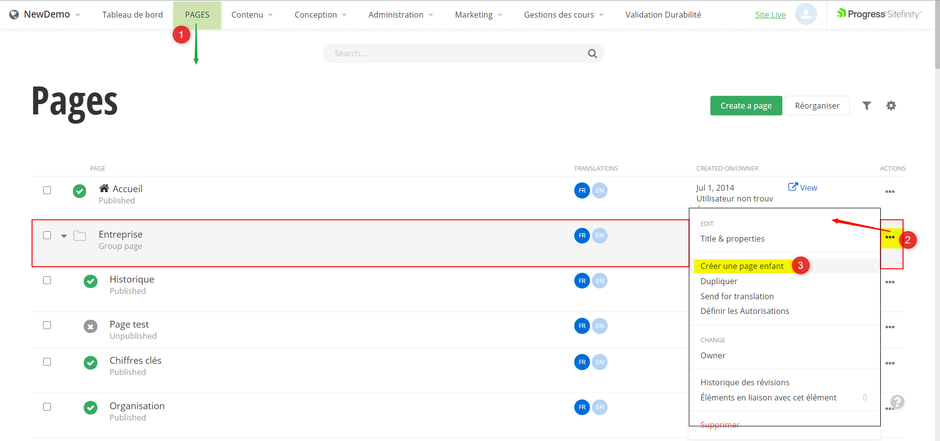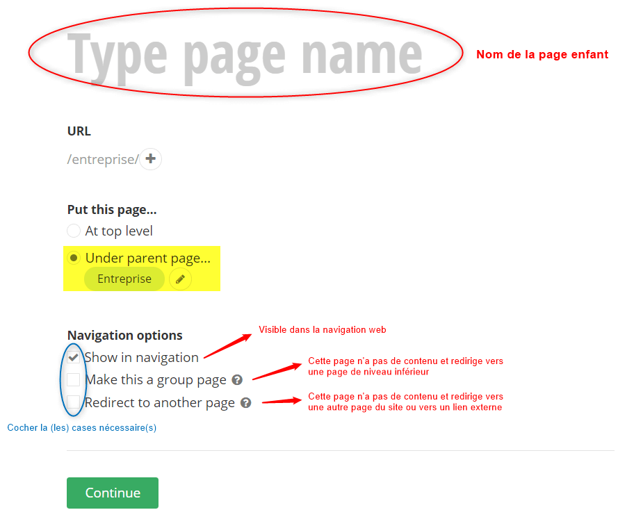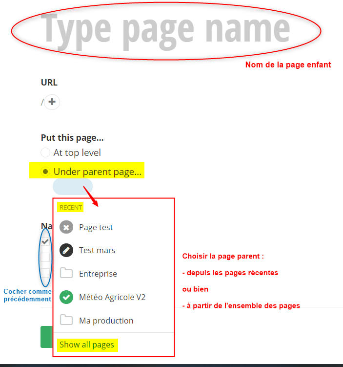 Lors de la création d’une nouvelle page, il est possible de hiérarchiser la structure de votre site internet selon deux procédés :