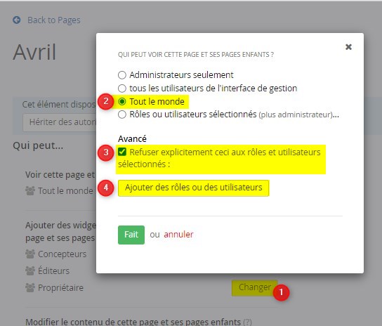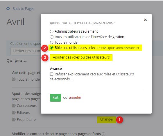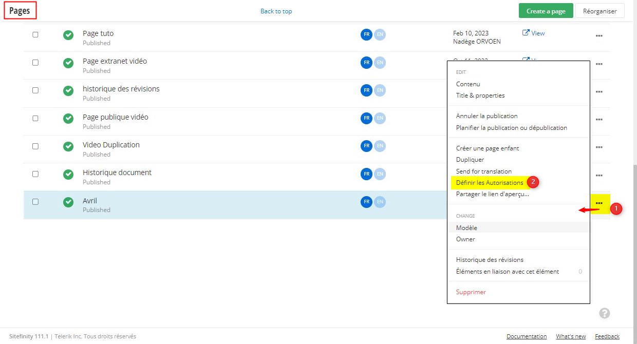 Depuis l'onglet Pages, pour la page concernée, cliquer sur “…” puis Définir les Autorisations