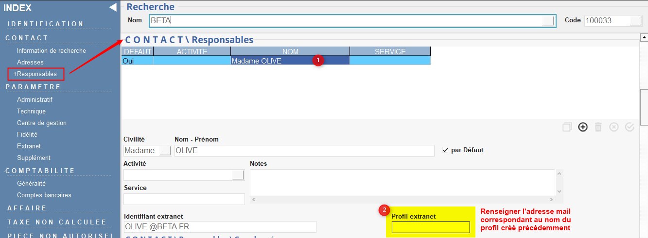 - Renseigner le profil extranet créé précédemment (Adresse mail).