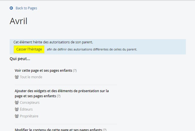 - La page dispose d'autorisations différentes de celles de son parent : Pour cela cliquer sur “Casser l'héritage”.
