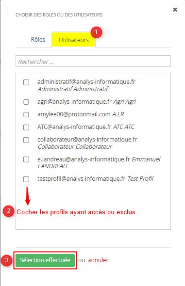 Puis Choisissez les utilisateurs profils à ajouter ou exclure via l'onglet “Utilisateurs” puis valider la “sélection effectuée”.