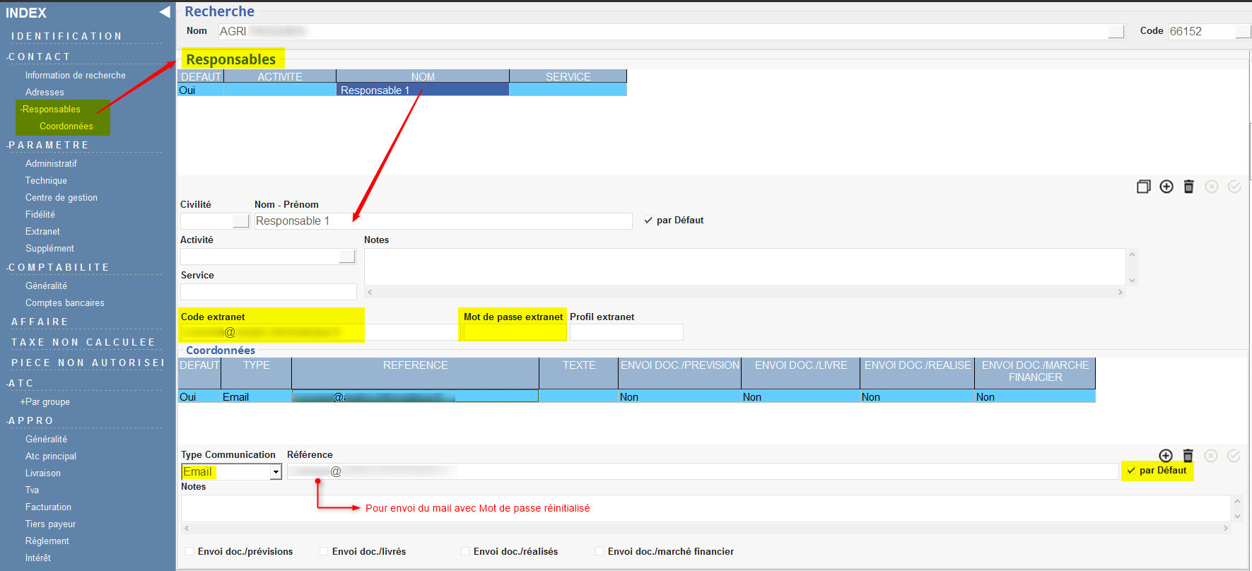 Authentification au niveau du Responsable : Contact/Responsable : L'adresse mail du Responsable se cascade automatiquement et le mot de passe se mettra à jour avec celui généré depuis l'extranet.