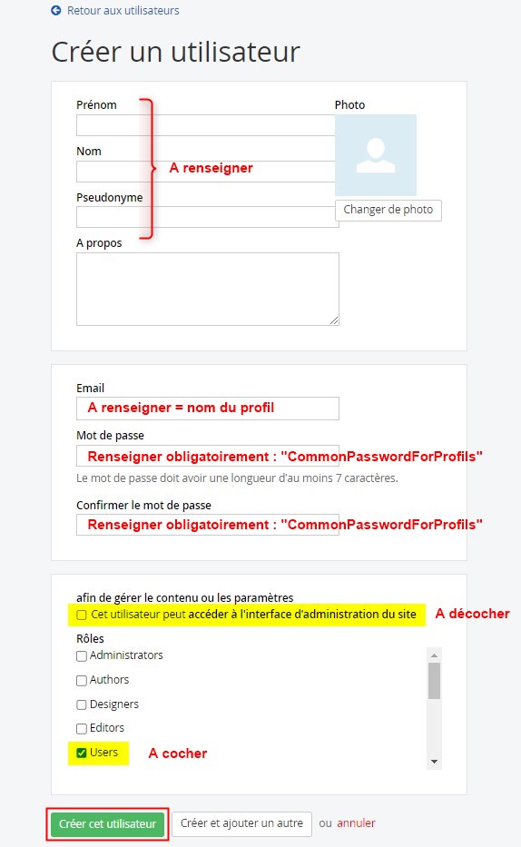 Il faut en réalité créer un utilisateur “profil” dont l'adresse mail correspondra au profil à créer. En effet, pour différencier les profils pré-configurés de ceux que vous pourrez créer, un formalisme a été mis en place : le nom des profils créés sera une adresse mail.
