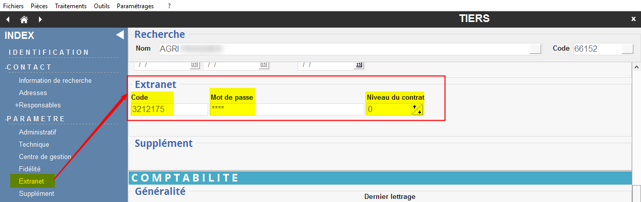 Au sein de la fiche Tiers : Paramètre-> Extranet