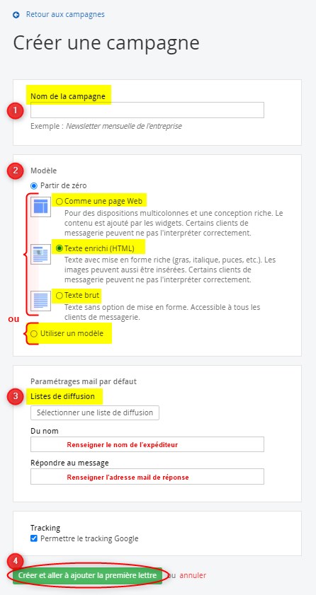 - Si Liste d'abonnés sélectionnée, il est proposé les listes déjà créées pour sélection.