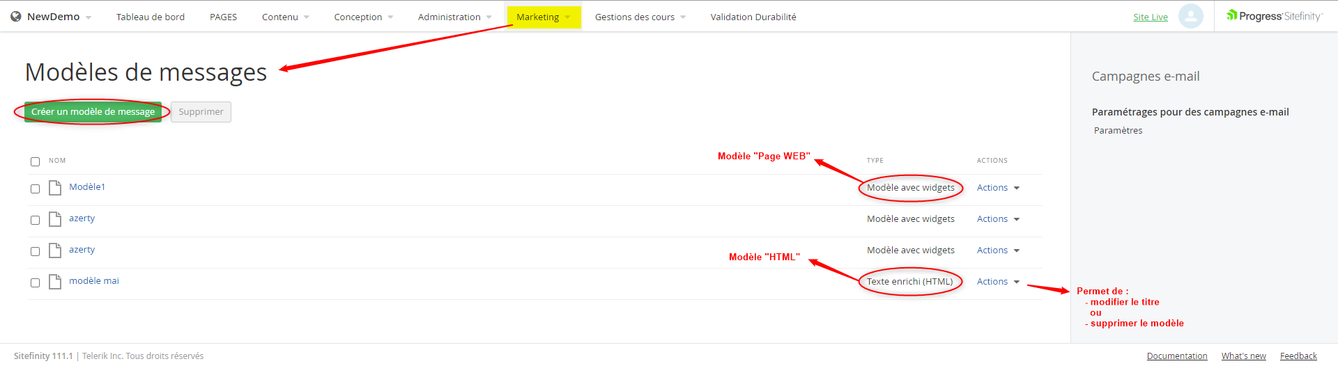 - Créer et envoyer des newsletters, par exemple, à certaines cibles (clients, prospects..). Dans l’onglet « Marketing », vous pouvez créer des campagnes e-mail en utilisant ou non des modèles de messages, semblables aux modèles de pages