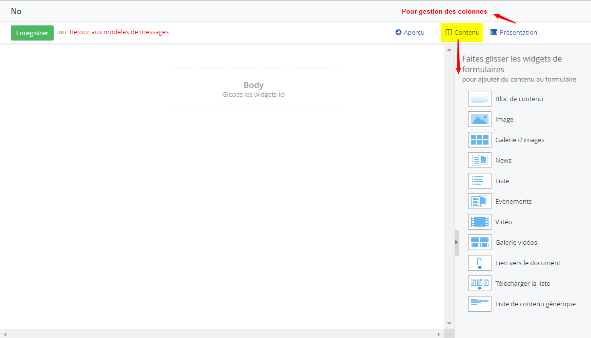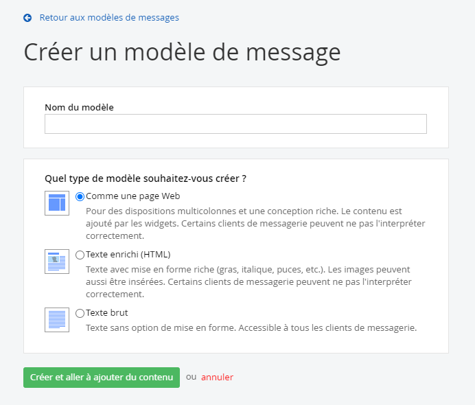 Le modèle « Page Web » se construit de la même manière qu’une page de votre site internet, en utilisant des layouts ainsi que des widgets de contenu.- Avantage : Ce mode vous permettra de faire des mises en page évoluées et agréables pour vos newsletters