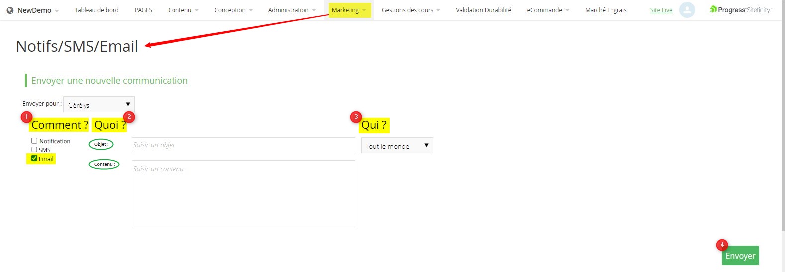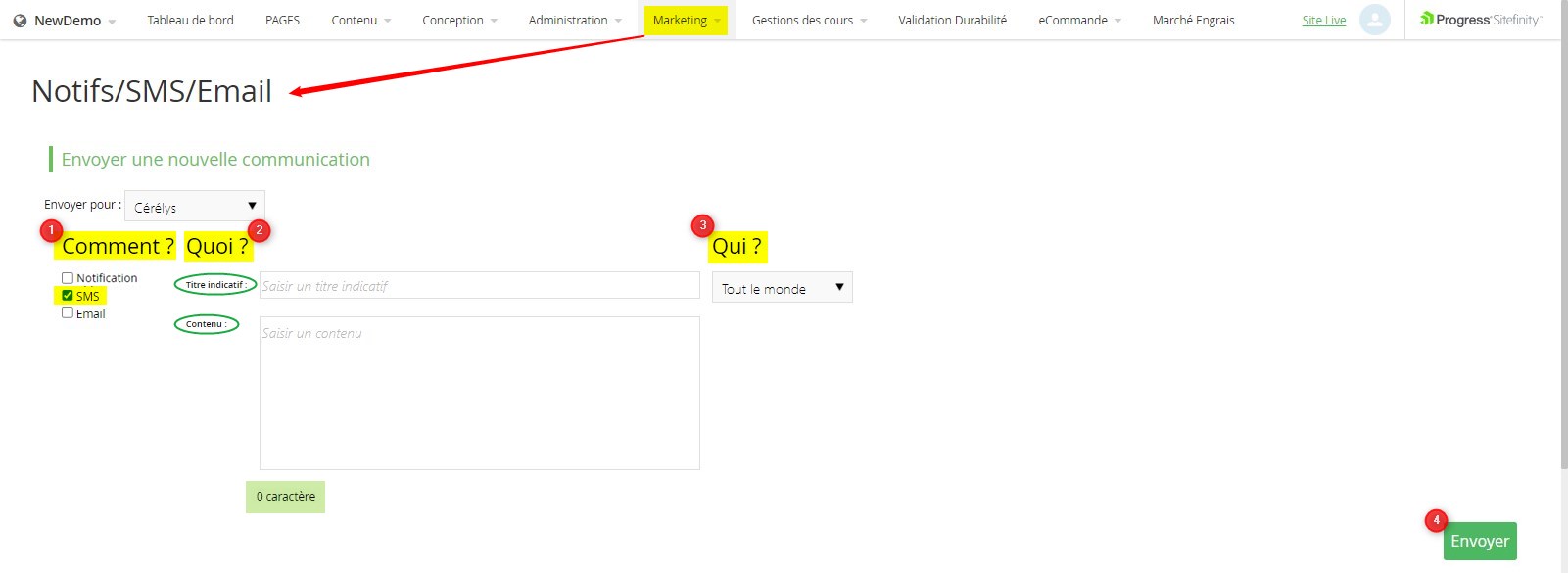 - Créer et envoyer des notifications/SMS à des listes d'abonnés