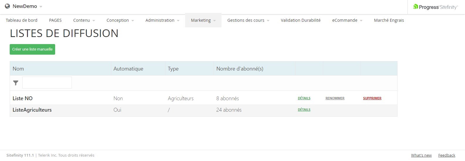 Vous avez accès au catalogue des listes de diffusion existantes. Il est alors précisé si elles proviennent d'une liste automatique (non modifiable et mise à jour, tous les jours, avec vos tiers Atys) ou manuelle (modifiable dans Sitefinity), pour quel type de compte et le nombre d'abonnés.