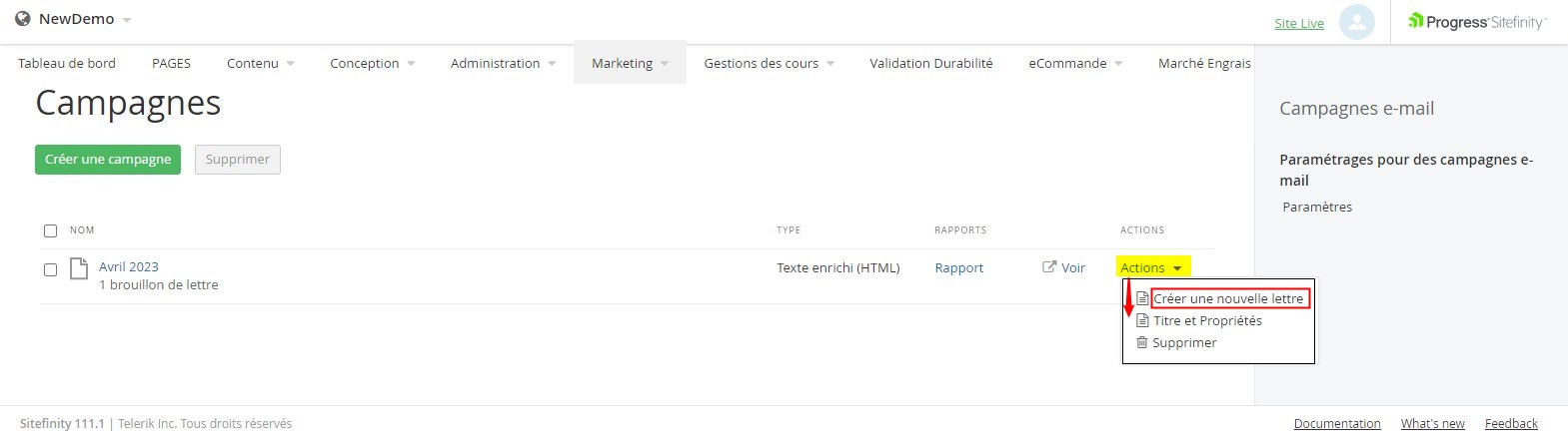 Si vous voulez ajouter une lettre à une campagne existante, depuis la page des campagnes, utilisez le bouton “Action” :