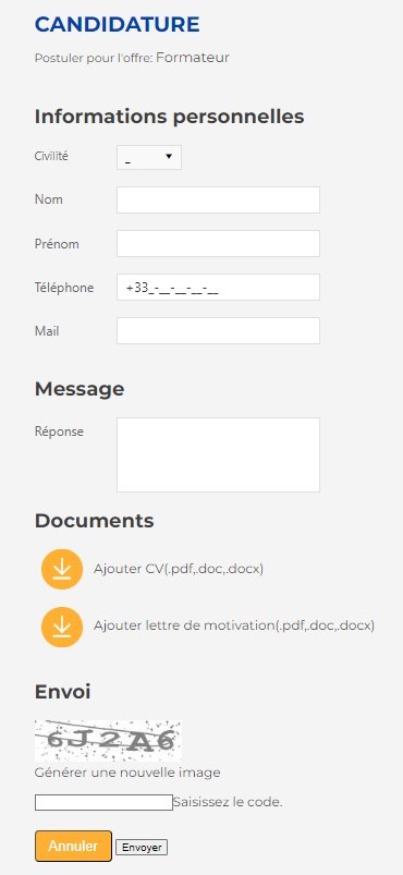 - Cliquer sur le bouton “Postuler” et remplir le formulaire (fourni avec le module RH) ci-dessous, pour transmettre leur candidature :