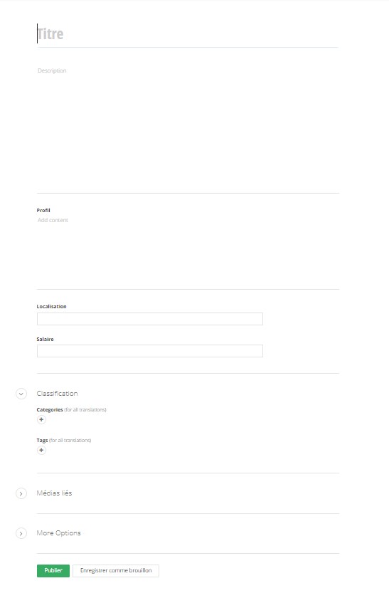 Cliquer sur “Create an offres emploi” et renseigner les champs suivants :