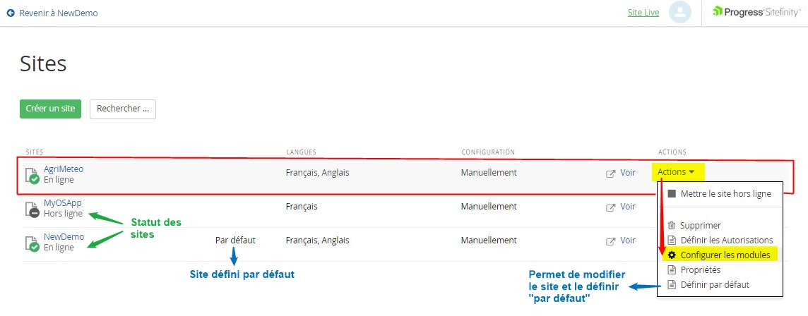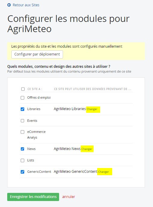 Configuration des modules à partager sur les différents sites